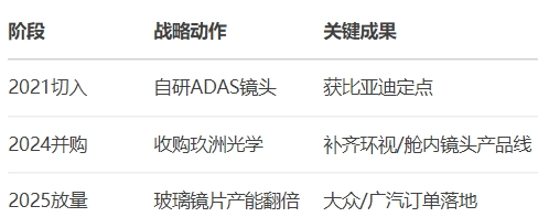 技術降維打擊顯效。200萬像素車載鏡頭單價壓至50元(索尼同類產品80元)。溫漂控制精度達0.03μm/℃(行業要求0.1μm/℃)。2024年車載營收暴漲52%至3.34億。