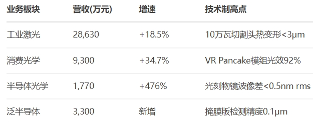 量檢測設備。激光準直系統(準直度0.001°)。缺陷檢測分光鏡(透過率99.8%)。2025年Q1半導體業務營收占比已升至7%,成為成長最快的業務線。