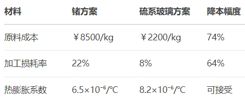 自主研發的紅外硫系玻璃實現三重突破。折射率2.0~3.0連續可調,透過波段覆蓋1-14μm,2024年通過車規級認證。