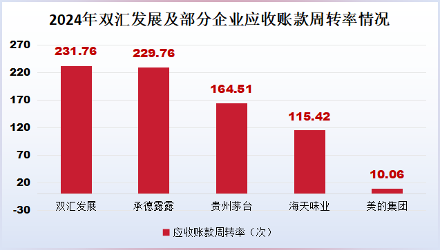 深入探究其高ROE的源泉,卓越的運營效率(尤其是應收賬款管理)功不可沒。2024年,雙匯應收賬款周轉率高達231.76次,遠超茅臺、美的、海天等巨頭。