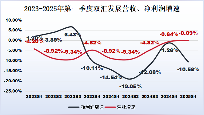 2025年Q1,雙匯營收142.95億元(同比-0.09%)、凈利潤11.37億元(同比-10.58%),延續了此前的下滑態勢。屠宰業務占比過半(2024年50.80%)的特性,使其深度綁定于劇烈波動的生豬周期。
