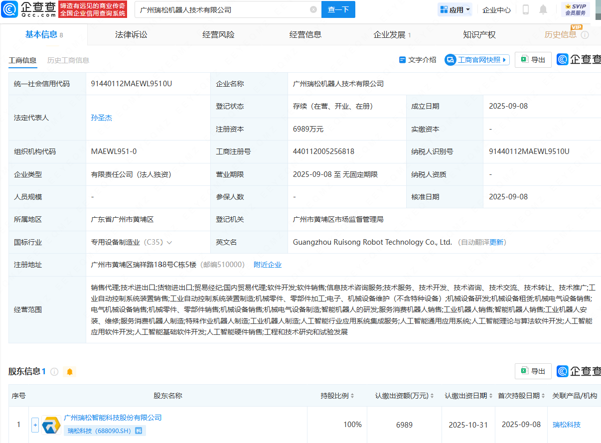 企查查APP顯示,近日,廣州瑞松機器人技術有限公司成立,法定代表人為孫圣杰,注冊資本為6989萬元,經營范圍包含:機械電氣設備制造;智能機器人的研發;服務消費機器人銷售;工業機器人銷售;智能機器人銷售;人工智能通用應用系統等。企查查股權穿透顯示,該公司由瑞松科技(688090)全資持股。