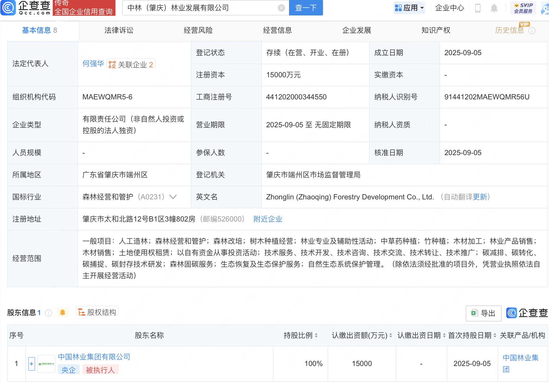 企查查APP顯示,近日,中林(肇慶)林業發展有限公司成立,法定代表人為何強華,注冊資本1.5億人民幣,經營范圍含人工造林,森林經營和管護,森林改培,樹木種植經營等。企查查股權穿透顯示,該公司由中國林業集團有限公司全資持股。