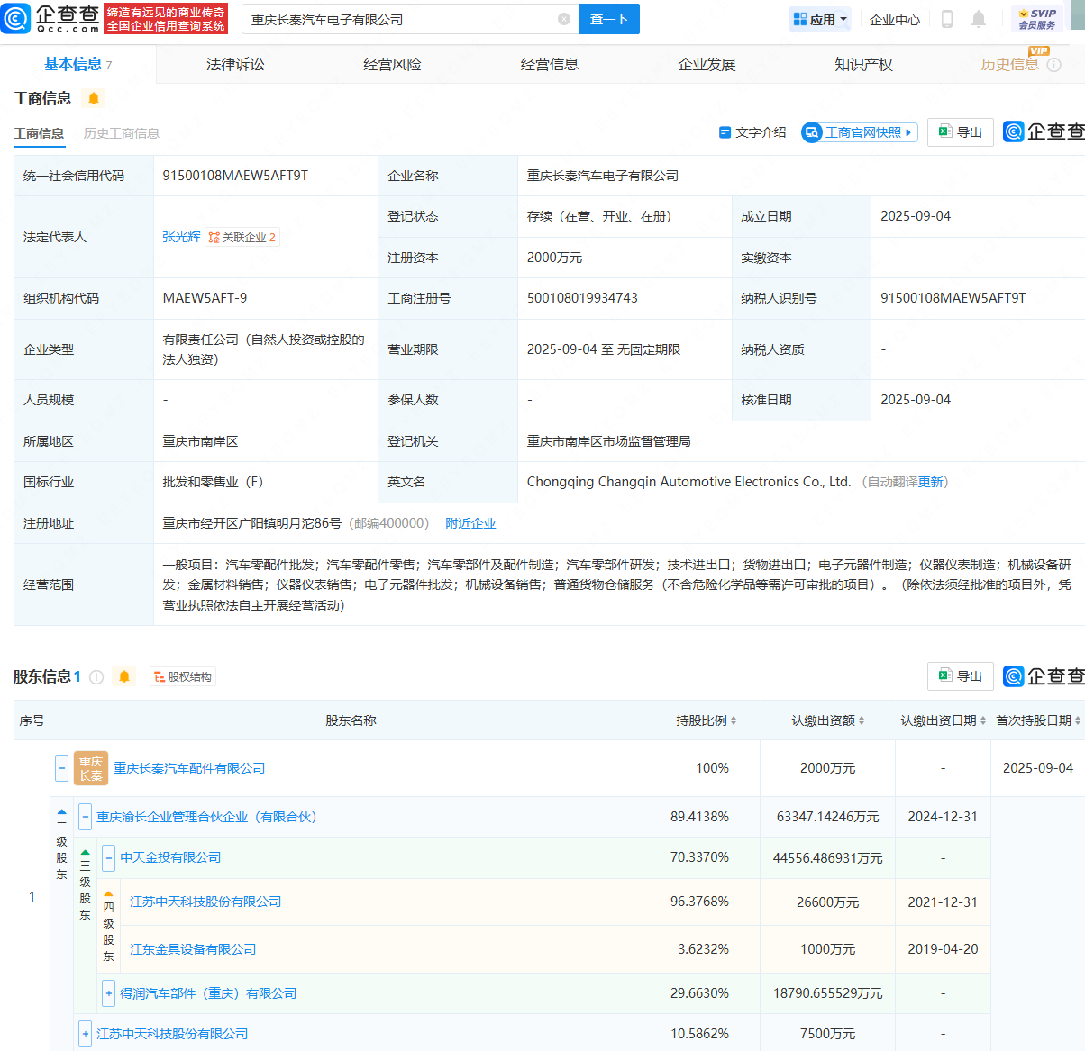 企查查APP顯示,近日,重慶長秦汽車電子有限公司成立,法定代表人為張光輝,注冊資本為2000萬元,經營范圍包含:汽車零配件批發;汽車零配件零售;汽車零部件及配件制造;汽車零部件研發;電子元器件批發等。企查查股權穿透顯示,該公司由中天科技(600522)旗下重慶長秦汽車配件有限公司全資持股。