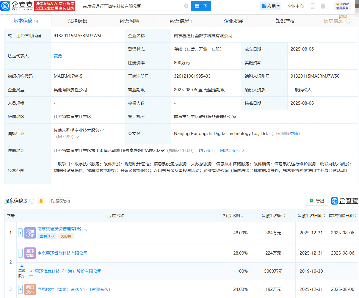 企查查APP顯示,近日,南京睿通行至數字科技有限公司成立,法定代表人為黃勇,經營范圍包含:數字技術服務;軟件開發;規劃設計管理;信息系統集成服務;大數據服務;物聯網技術研發等。企查查股權穿透顯示,該公司由南京交通投資管理有限公司、星環科技(688031)旗下南京星環智能科技有限公司等共同持股。