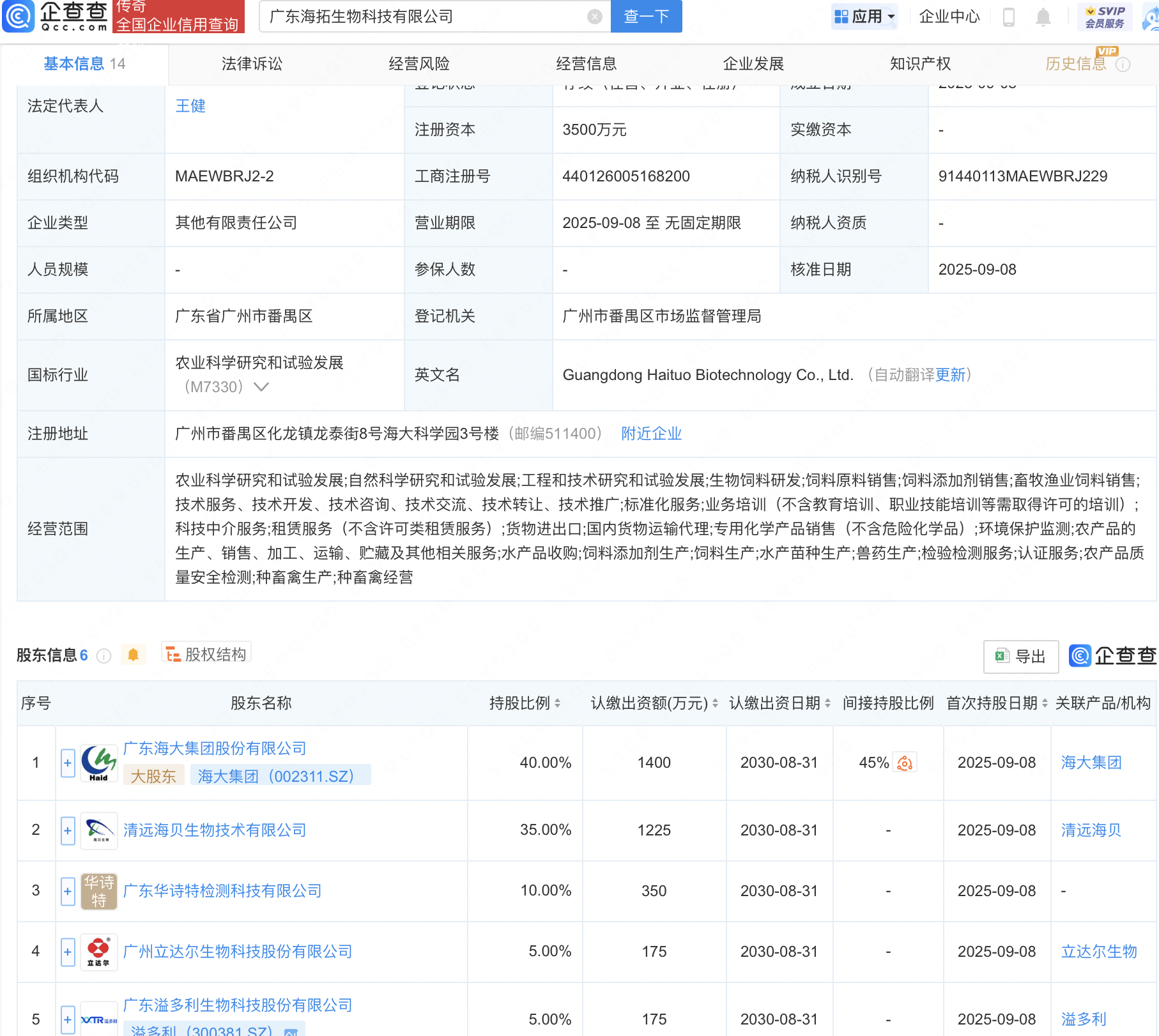 企查查APP顯示,近日,廣東海拓生物科技有限公司成立,注冊資本3500萬元,經營范圍包含:環境保護監測;農產品的生產、銷售、加工、運輸、貯藏及其他相關服務等。企查查股權穿透顯示,該公司由海大集團(002311)、溢多利(300381)等共同持股。