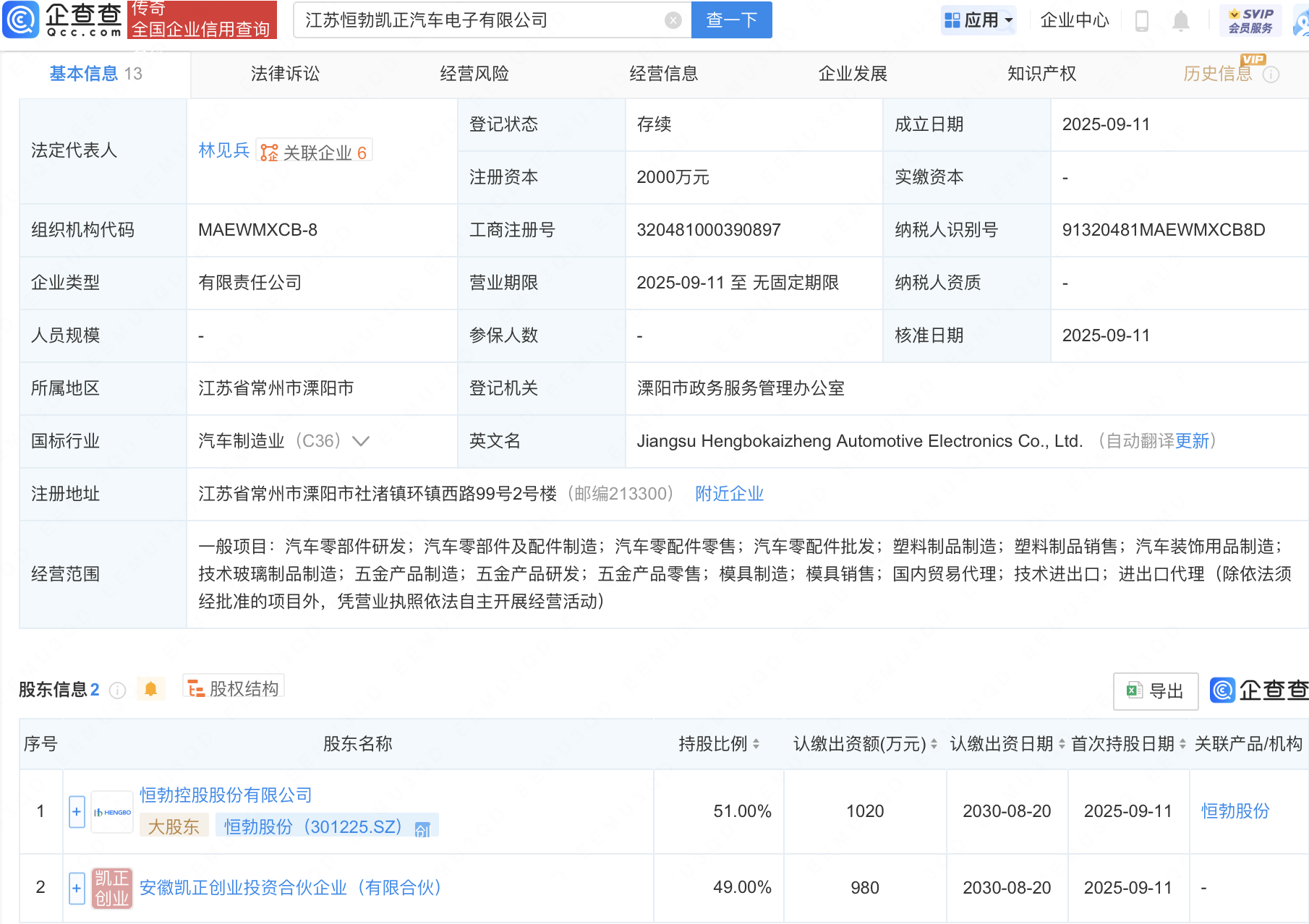 企查查APP顯示,近日,江蘇恒勃凱正汽車電子有限公司成立,注冊資本2000萬元,經營范圍包含:汽車零部件研發;汽車零部件及配件制造;汽車零配件零售等。企查查股權穿透顯示,該公司由恒勃股份(301225)等共同持股。