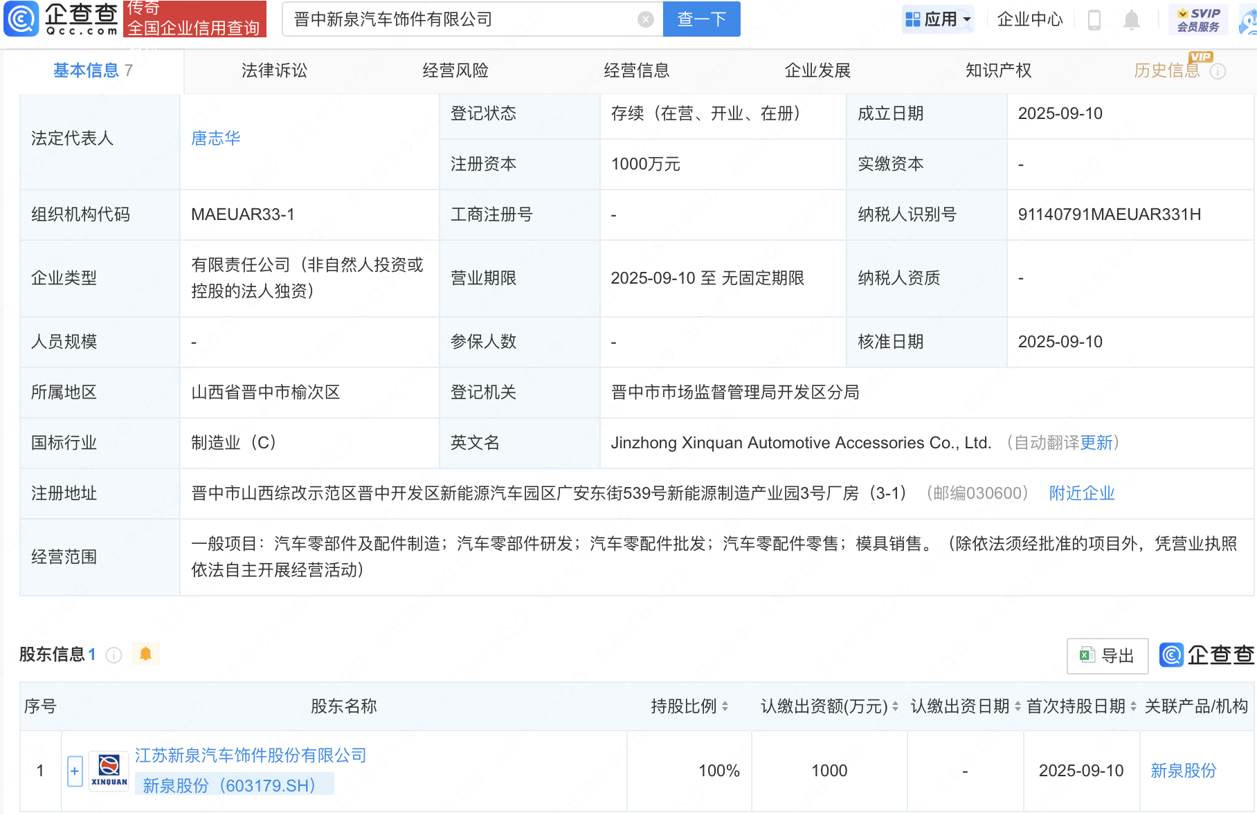 企查查APP顯示,近日,晉中新泉汽車飾件有限公司成立,注冊資本1000萬元,經營范圍包含:汽車零部件及配件制造;汽車零部件研發;汽車零配件批發;汽車零配件零售;模具銷售。企查查股權穿透顯示,該公司由新泉股份(603179)全資持股。