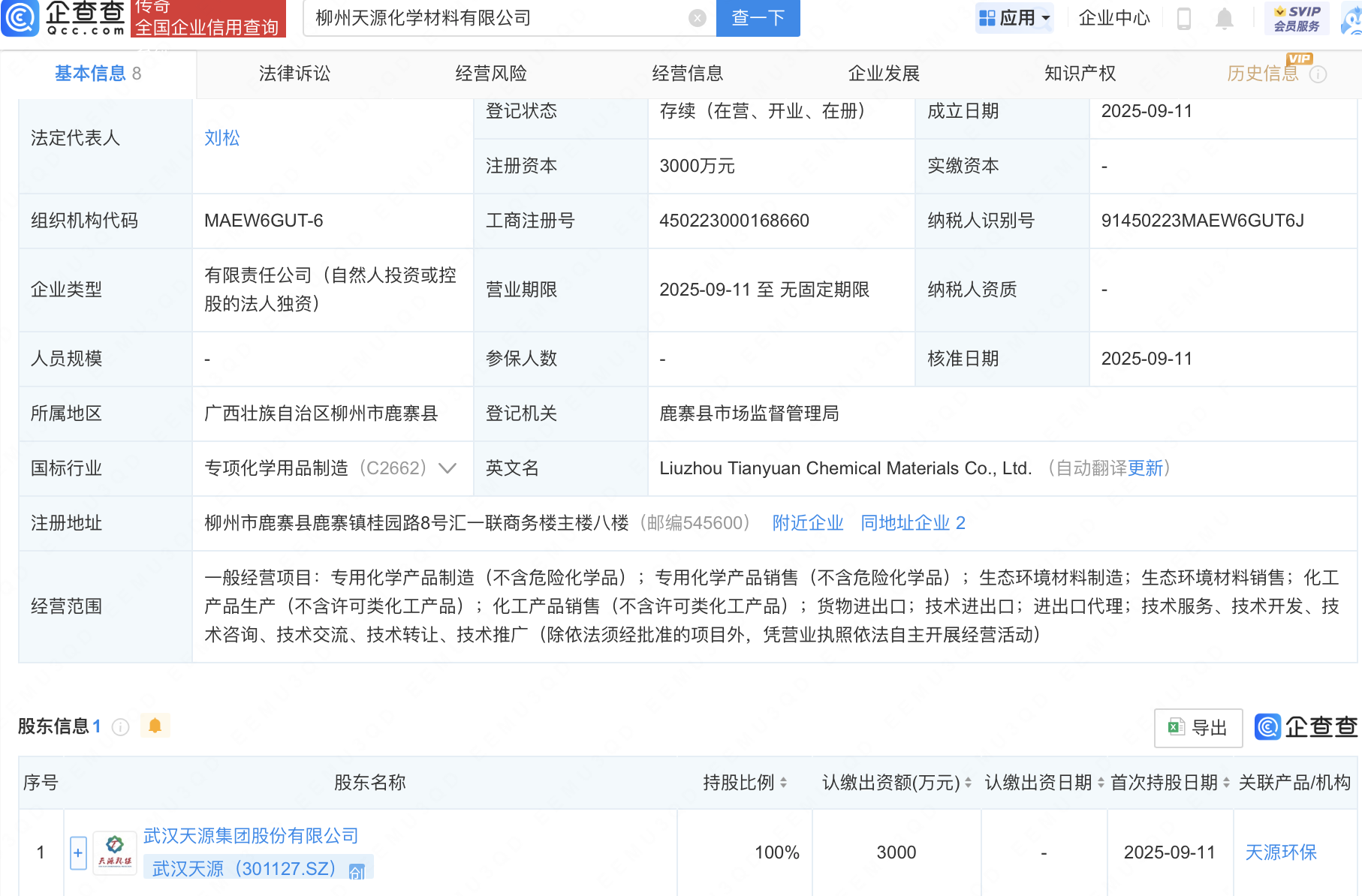 企查查APP顯示,近日,柳州天源化學材料有限公司成立,注冊資本3000萬元,經營范圍包含:生態環境材料制造;生態環境材料銷售;化工產品生產(不含許可類化工產品)等。企查查股權穿透顯示,該公司由武漢天源(301127)全資持股。