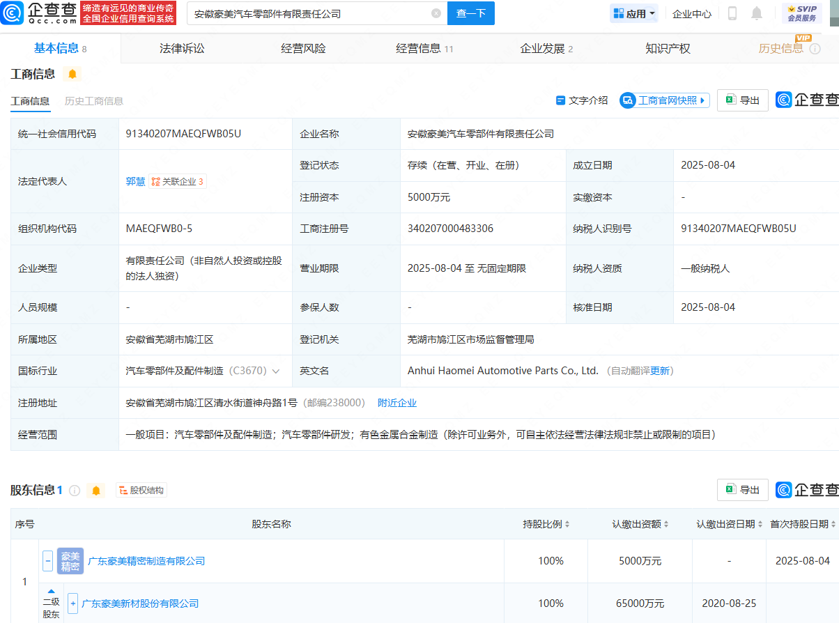 企查查APP顯示,近日,安徽豪美汽車零部件有限責任公司成立,法定代表人為郭慧,注冊資本為5000萬元,經營范圍包含:汽車零部件及配件制造;汽車零部件研發;有色金屬合金制造。企查查股權穿透顯示,該公司由豪美新材(002988)間接全資持股。