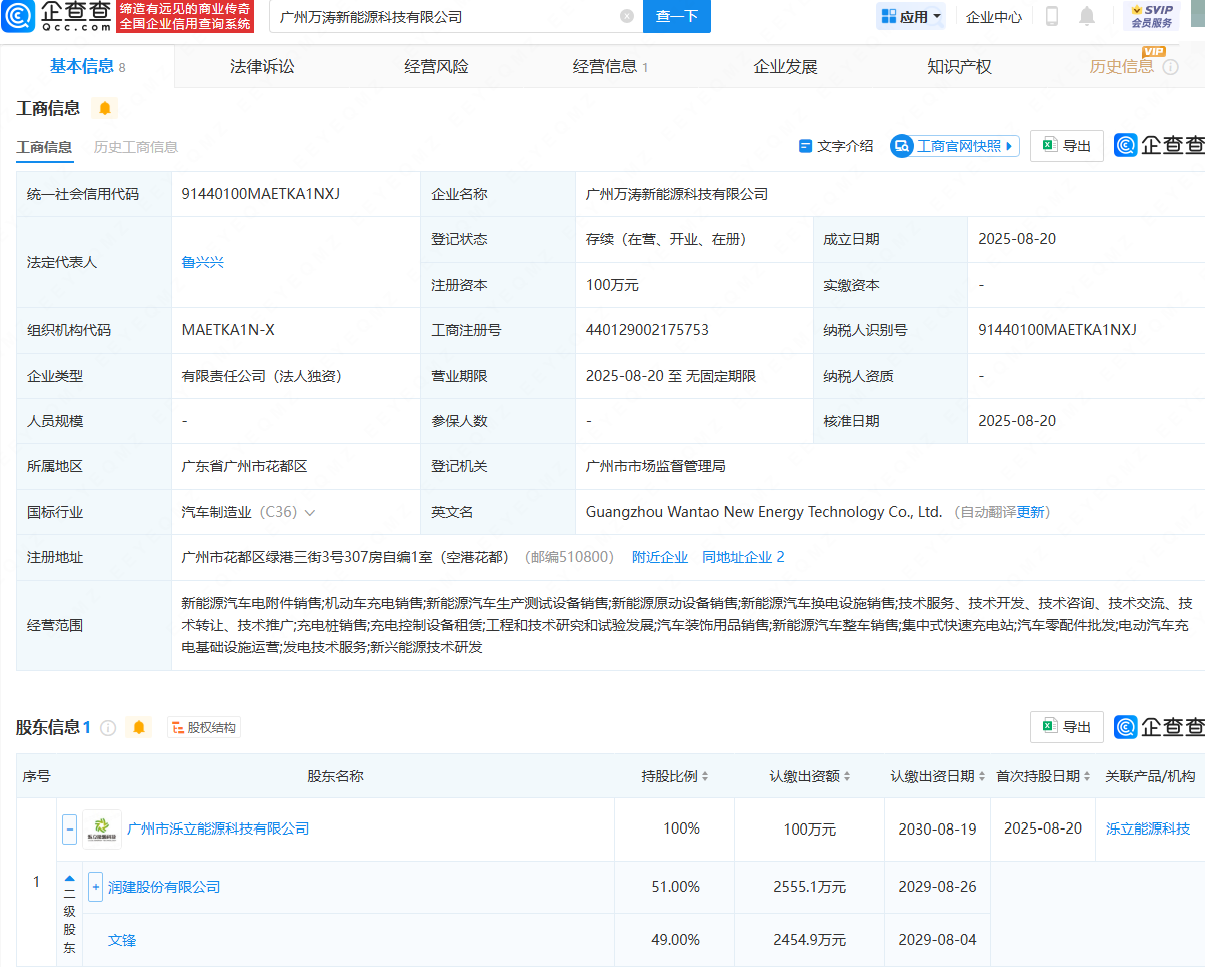 企查查APP顯示,近日,廣州萬濤新能源科技有限公司成立,法定代表人為魯興興,經營范圍包含:新能源汽車電附件銷售;新能源汽車生產測試設備銷售;充電樁銷售;充電控制設備租賃;集中式快速充電站等。企查查股權穿透顯示,該公司由潤建股份(002929)旗下廣州市濼立能源科技有限公司全資持股。