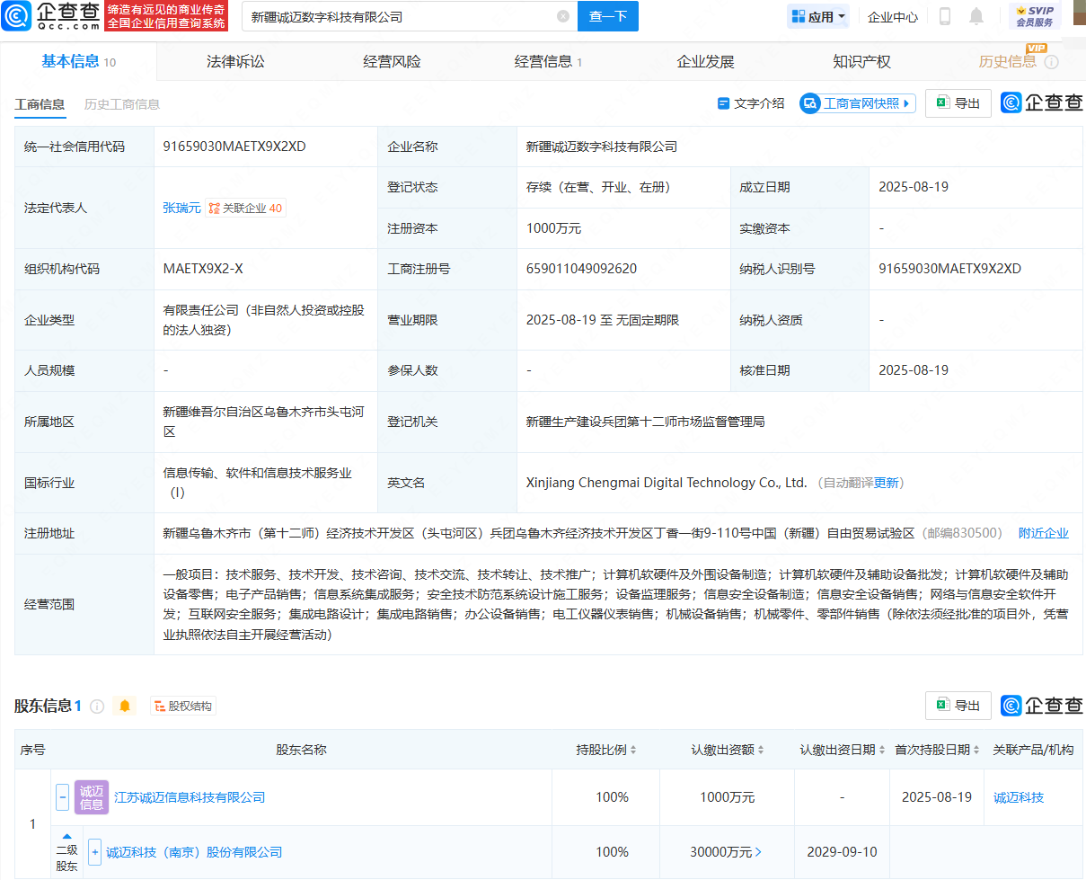 企查查APP顯示,近日,新疆誠邁數字科技有限公司成立,法定代表人為張瑞元,注冊資本為1000萬元,經營范圍包含:電子產品銷售;信息系統集成服務;互聯網安全服務;集成電路設計;集成電路銷售等。企查查股權穿透顯示,該公司由誠邁科技(300598)間接全資持股。