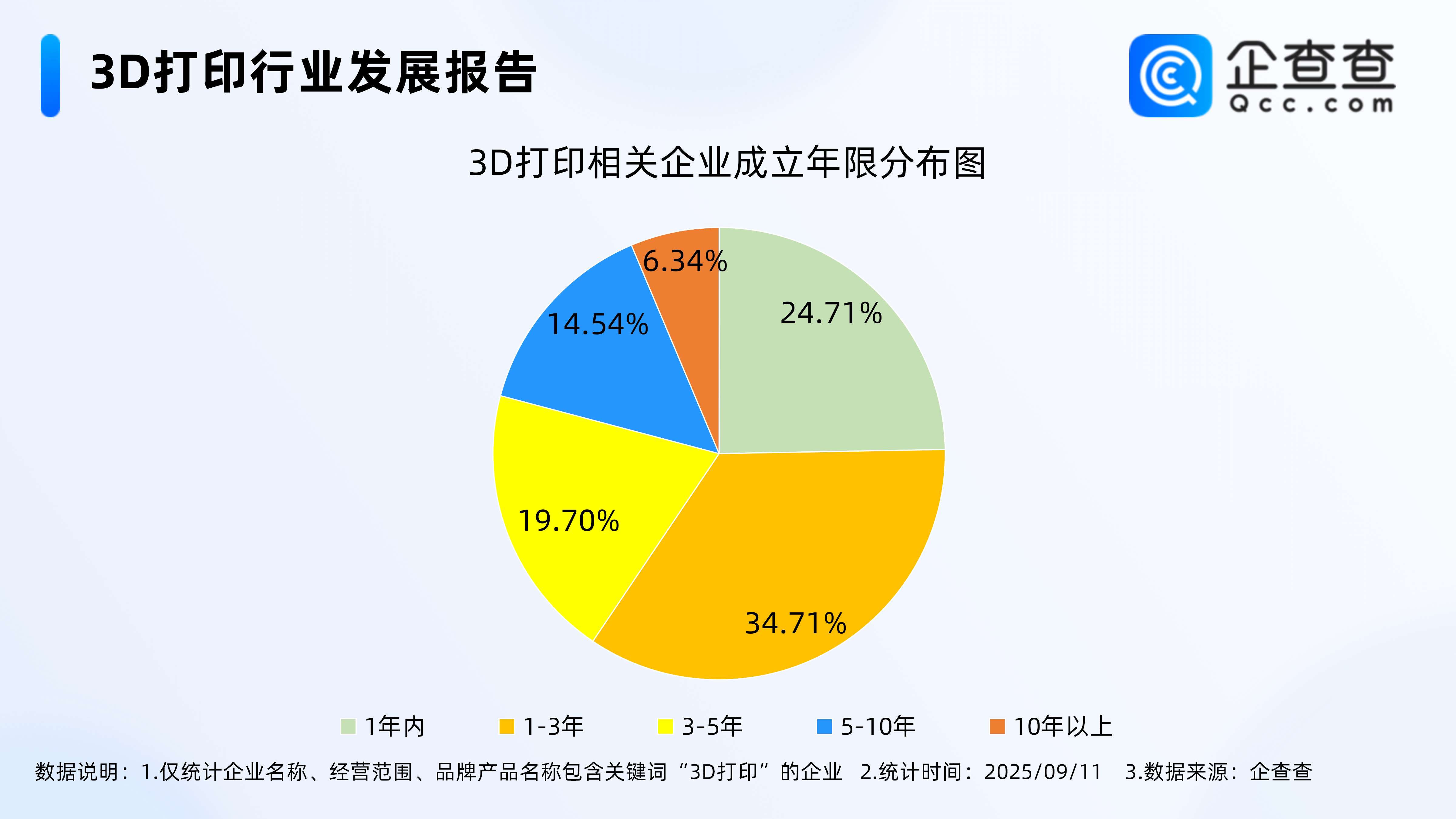 企查查數據顯示,從經營時間來看,近六成3D打印相關企業成立于近三年,其中成立年限在1-3年的相關企業最多,占比34.71%。成立年限在1年內的相關企業占比24.71%。