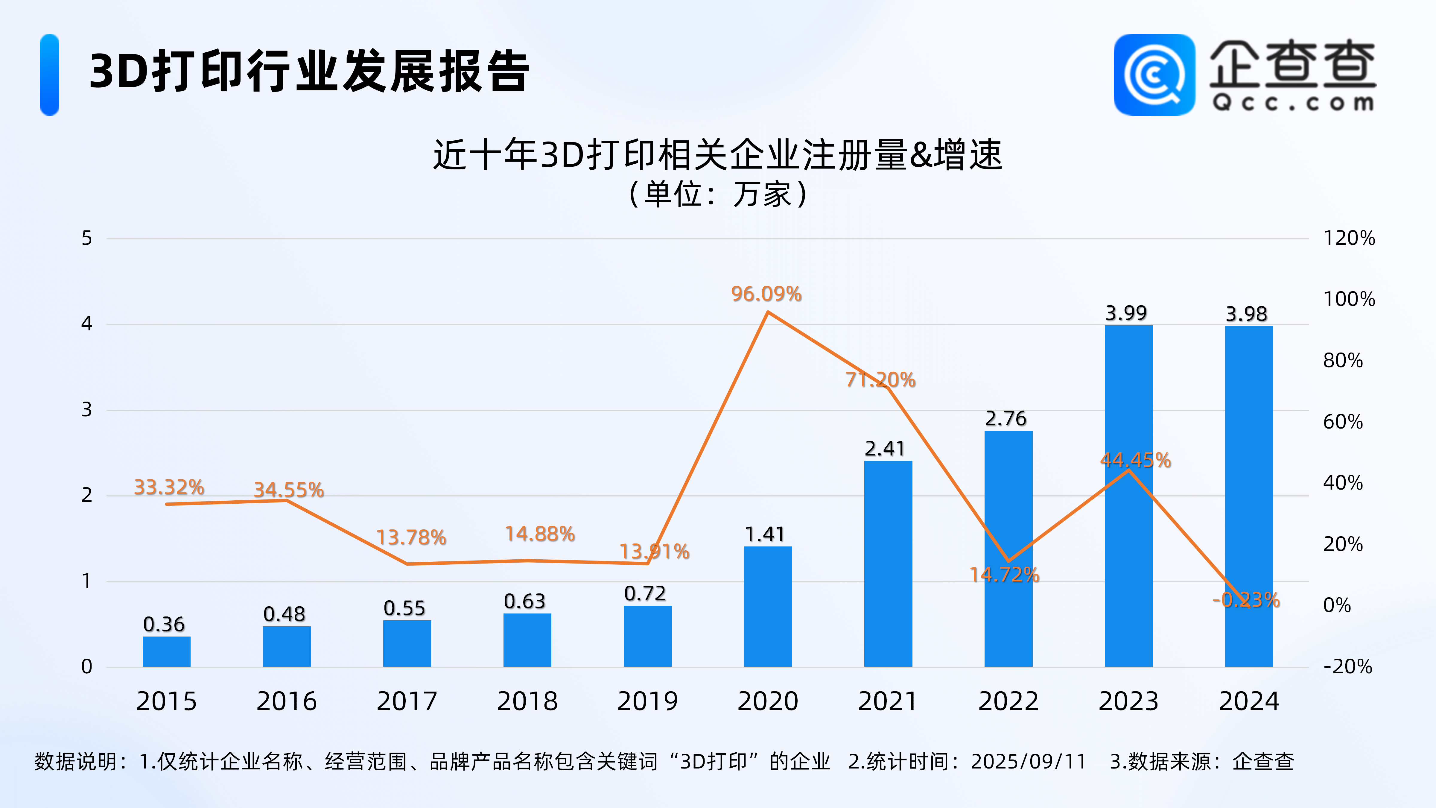 企查查數據顯示,國內現存3D打印相關企業17.77萬家。近十年相關企業注冊量呈整體增長態勢,2023年全年注冊3.99萬家相關企業,同比增長44.45%,達近十年注冊量峰值。2024年全年注冊3.98萬家相關企業,與前一年全年注冊水平趨近持平。截至目前,今年已注冊3.26萬家相關企業,其中前8月注冊3.13萬家,同比增長20.19%。
