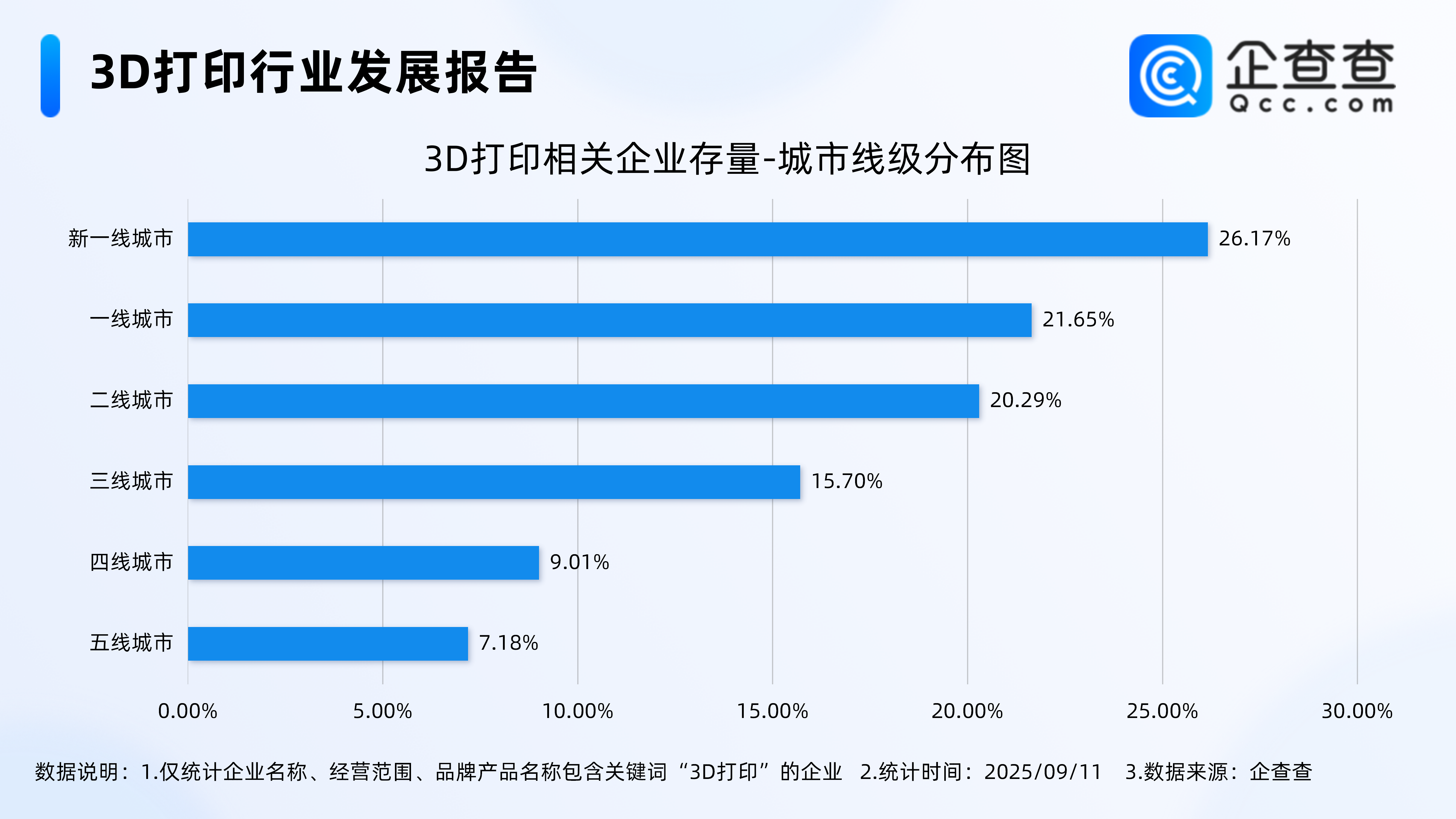 企查查數據顯示,從城市線級分布來看,分布在新一線城市的3D打印相關企業最多,占比26.17%。其次,分布在一線城市、二線城市的相關企業分別占比21.65%、20.29%。
