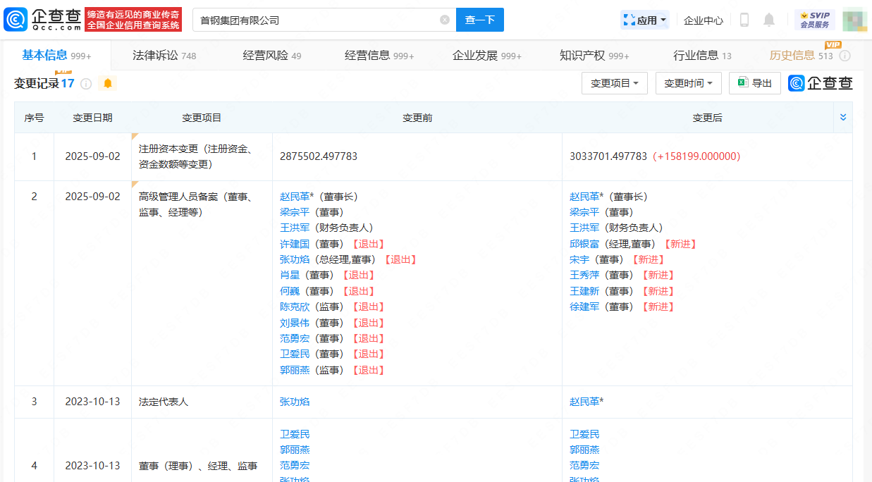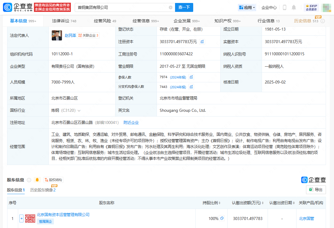 企查查APP顯示,近日,首鋼集團有限公司發生工商變更,注冊資本由約287.55億人民幣增至約303.37億人民幣,同時多位主要人員發生變更。企查查信息顯示,該公司成立于1981年5月,法定代表人為趙民革,經營范圍涉及工業、建筑、地質勘探、交通運輸、對外貿易、郵電通訊、金融保險、科學研究和綜合技術服務業、國內商業、公共飲食等,由北京國有資本運營管理有限公司全資持股。