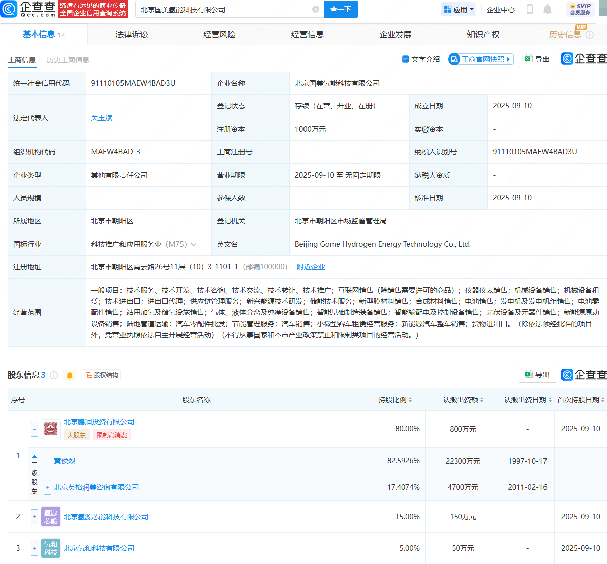 企查查APP顯示,近日,北京國美氫能科技有限公司成立,法定代表人為關玉斌,注冊資本為1000萬元,經營范圍包含:供應鏈管理服務;新興能源技術研發;儲能技術服務;新型膜材料銷售;合成材料銷售;電池銷售等。企查查股權穿透顯示,該公司由黃光裕(即黃俊烈)控股北京鵬潤投資有限公司、北京氫源芯能科技有限公司等共同持股。