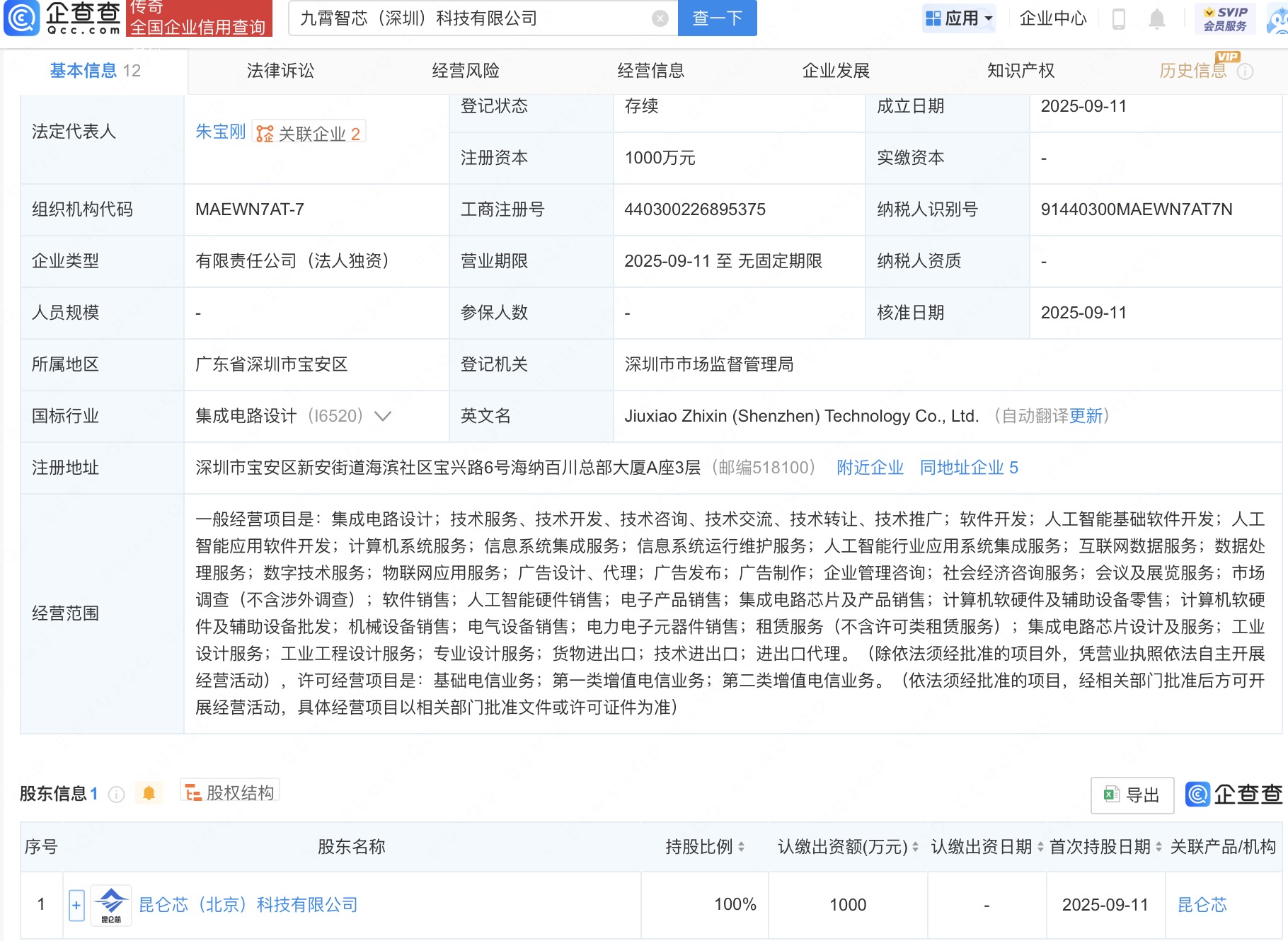 企查查APP顯示,近日,九霄智芯(深圳)科技有限公司成立,法定代表人為朱寶剛,注冊資本1000萬人民幣,經營范圍包括集成電路設計、人工智能基礎軟件開發、人工智能應用軟件開發等。企查查股權穿透顯示,該公司由昆侖芯(北京)科技有限公司全資持股。