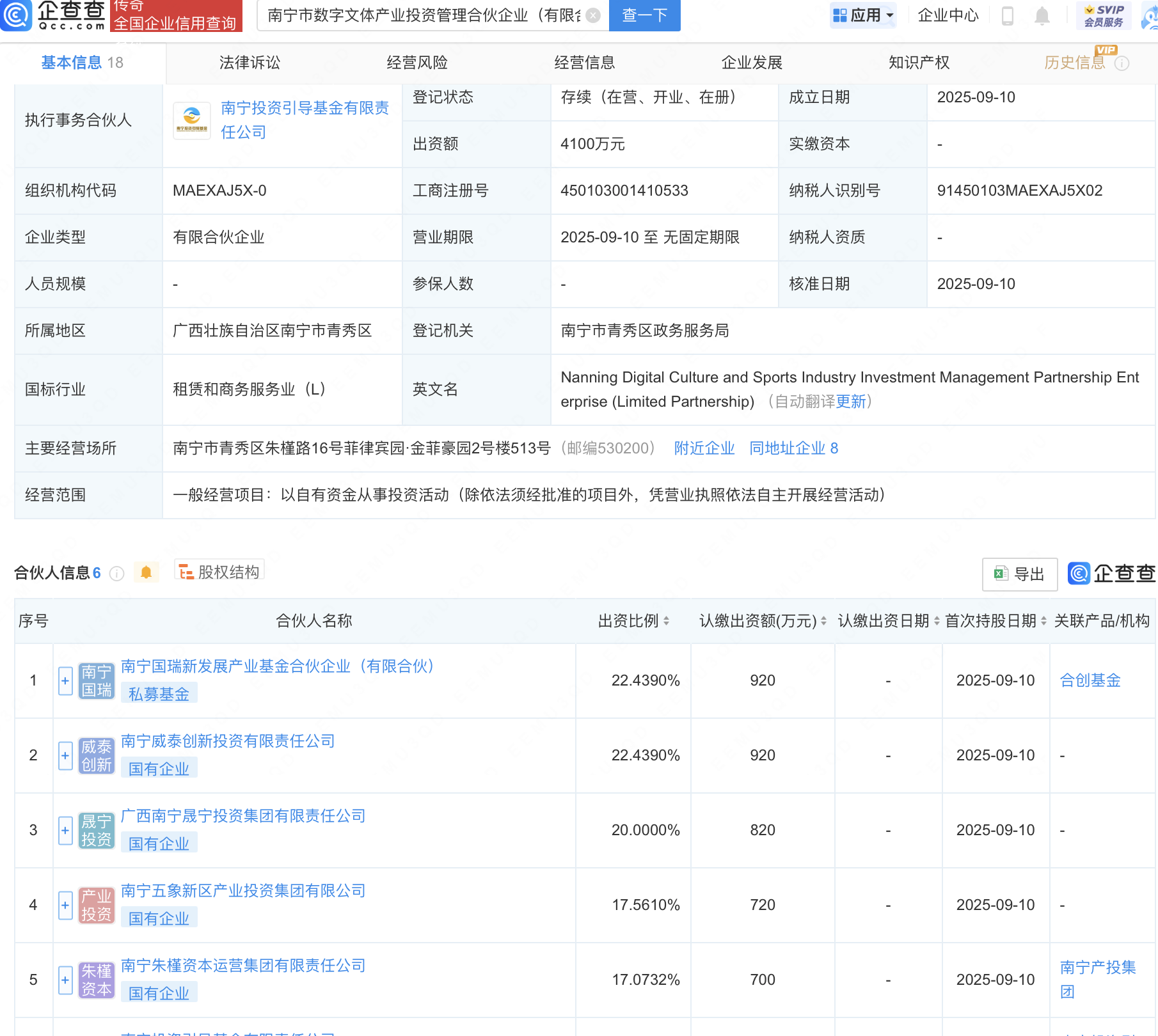 企查查APP顯示,近日,南寧市數字文體產業投資管理合伙企業(有限合伙)成立,經營范圍包含:以自有資金從事投資活動。企查查股權穿透顯示,該企業由南寧國瑞新發展產業基金合伙企業(有限合伙)等共同出資。
