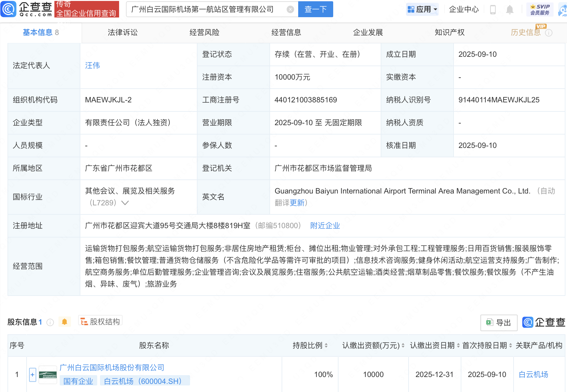 企查查APP顯示,近日,廣州白云國際機場第一航站區管理有限公司成立,注冊資本1億元,經營范圍包含:航空運營支持服務;廣告制作;航空商務服務;單位后勤管理服務等。企查查股權穿透顯示,該公司由白云機場(600004)全資持股。