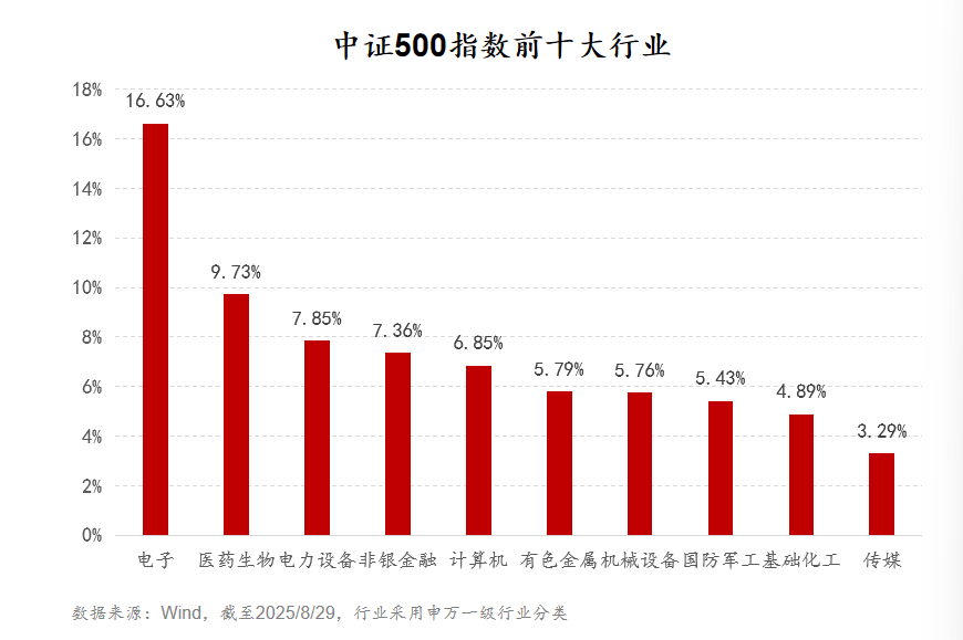 行業配置均衡,是中證500指數的特色與優勢。中證500指數前十大行業中既包含電子(16.63%)、醫藥生物(9.73%)、電力設備(7.85%)、計算機(6.85%)等新經濟行業,也囊括非銀金融(7.36%)、有色金屬(5.79%)、機械設備(5.76%)、基礎化工(4.89%)等傳統行業。(數據來源:Wind,截至2025/8/29,行業采用申萬一級行業分類)