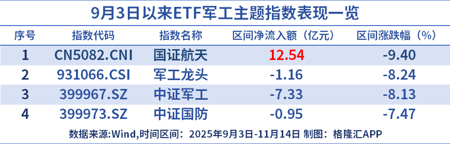 值得一提的是,軍工(gong)板塊自9月3日(ri)以來(lai)持(chi)續回調,國(guo)證(zheng)(zheng)航(hang)天、軍工(gong)龍頭、中(zhong)證(zheng)(zheng)國(guo)防、中(zhong)證(zheng)(zheng)軍工(gong)指(zhi)數(shu)期(qi)(qi)內跌幅超7%,但國(guo)證(zheng)(zheng)航(hang)天指(zhi)數(shu)是唯一獲得資金“越跌越抄底(di)”的軍工(gong)主題指(zhi)數(shu),期(qi)(qi)內相關(guan)ETF凈流入額超12億(yi)元(yuan)。