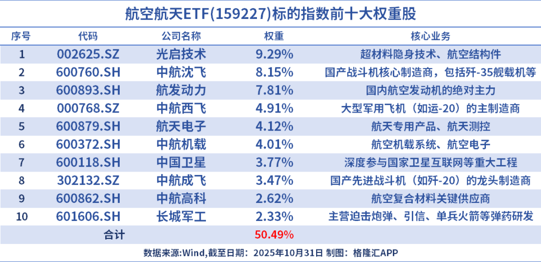 航(hang)空航(hang)天ETF(159227)的前十(shi)大權重股清晰(xi)地展現了航(hang)(hang)空航(hang)(hang)天產(chan)業的核心(xin)鏈條,從最前端的航(hang)(hang)空發(fa)動(dong)(dong)機(ji)(ji)(ji)(航(hang)(hang)發(fa)動(dong)(dong)力(li))、航(hang)(hang)空材料(中(zhong)航(hang)(hang)高科、中(zhong)航(hang)(hang)重機(ji)(ji)(ji)),到關(guan)鍵的機(ji)(ji)(ji)載(zai)系統(中(zhong)航(hang)(hang)機(ji)(ji)(ji)載(zai)),再到最終的飛(fei)(fei)機(ji)(ji)(ji)整機(ji)(ji)(ji)(中(zhong)航(hang)(hang)沈飛(fei)(fei)、中(zhong)航(hang)(hang)西飛(fei)(fei)、中(zhong)航(hang)(hang)成(cheng)飛(fei)(fei))和航(hang)(hang)天系統(航(hang)(hang)天電(dian)子、中(zhong)國衛星),使得該ETF能夠深度(du)綁定軍機(ji)(ji)(ji)換代、大飛(fei)(fei)機(ji)(ji)(ji)、低空經濟和衛星互(hu)聯網等國家戰略性需求,契(qi)合"航(hang)(hang)天強(qiang)國"的導向。