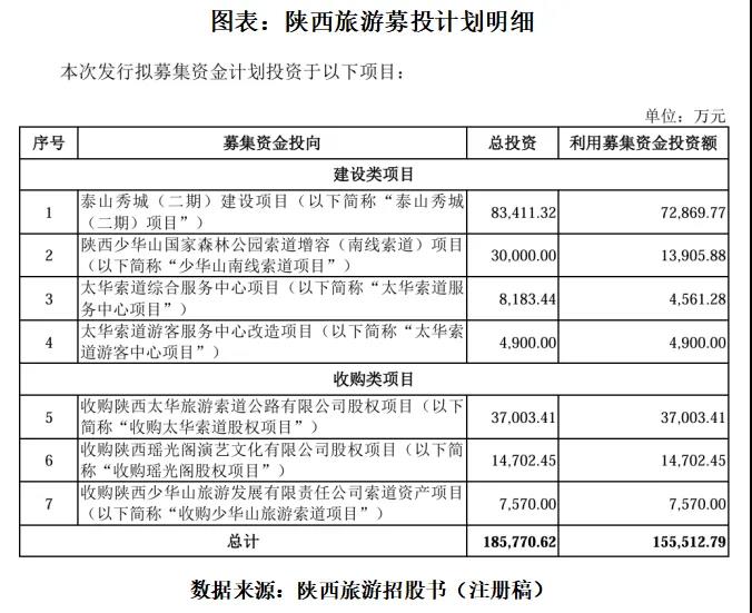 招股(gu)書(shu)顯示,陜西旅游擬募資15.55億(yi)元,其中用7.29億(yi)元投建泰(tai)山秀(xiu)城二期項(xiang)目(mu),1.39億(yi)元投建少華山南線索道項(xiang)目(mu)。